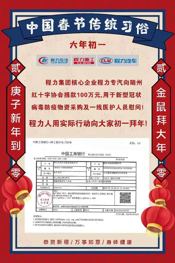 湖北程力公司捐款100萬為新型肺炎防控