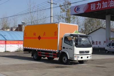 運輸品名:炸藥,雷管,煙花爆竹等,類項號:1.1B,1.1D,1.1G,1.2G,1.3G,1.4G 等。廂體頂部封閉不可開啟,側、后防護裝置材料材質為Q235A碳鋼,側防護與箱體底部焊接連接,后防護裝置與車架采用焊接連接,后防護截面尺寸(mm):100×50,離地高度為450mm。該車隨底盤選裝駕駛室,選裝側面開門。僅選用發動機型號: ISB3.9-125E40A、YC4E140-42對應的油耗值分別為(L/100km): 18.83、19.39。安裝前輪盤式制動器,安裝子午線輪胎和帶ABS的底盤。安裝帶有衛星定位功能的行駛記錄儀。ABS系統生產廠家/型號:東風電子科技股份有限公司汽車制動系統公司/36BG13-30010。 |