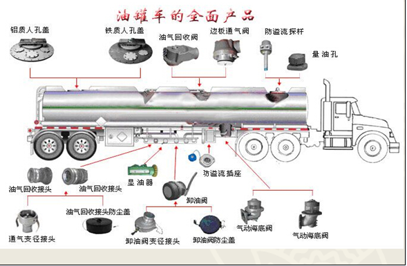 (1)海底閥:又稱緊急切斷閥,安裝于罐體底部,進(jìn)行下裝加油時(shí)使用,在油罐發(fā)生意外時(shí),由于斷槽處于無(wú)法承載過(guò)大沖力,車(chē)體管路與罐體會(huì)自動(dòng)斷開(kāi),而自動(dòng)對(duì)中柱塞和耐用彈簧會(huì)依舊保持密封,罐內(nèi)介質(zhì)不會(huì)泄漏,從而保證油罐安全。 (2)油氣回系統(tǒng):①油氣回收閥:是將在裝卸油料時(shí)所產(chǎn)生的油氣回收的一種裝置,可以直接安裝在油罐車(chē)頂部罐體上,避免了油氣外泄。 ②油氣回收接頭:罐車(chē)油氣回收系統(tǒng)組成一個(gè)封閉的循環(huán)系統(tǒng),有效的將在油站加油過(guò)程中產(chǎn)生的油氣回收再利用,避免了油氣擴(kuò)散